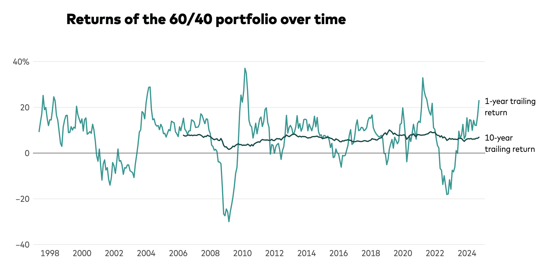 As the Vanguard article noted, “. . . the 60/40 portfolio can be a wise choice for clients with a moderate risk tolerance seeking broad diversification and a track record of solid long-term results.” But remember that this was a time of dramatic interest rate reductions, which drove up bond prices. It also assumes you’ve stayed invested through all the ups and downs since then.