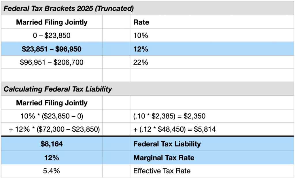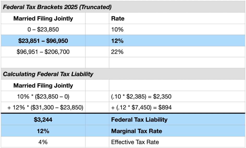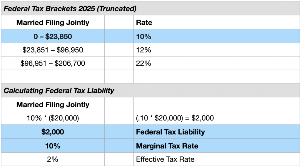 (*”Effective Tax Rate” is the same as “average tax rate,” which would typically be lower than your “marginal tax rate.”)