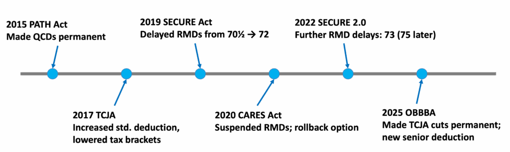 I’ve already discussed several key components of the retirement tax puzzle: Required Minimum Distributions (RMDs), Qualified Charitable Distributions (QCDs), charitable giving strategies, and the changes introduced by the 2025 “One Big Beautiful Bill” Act (OBBBA), as well as how I’ve implemented them.