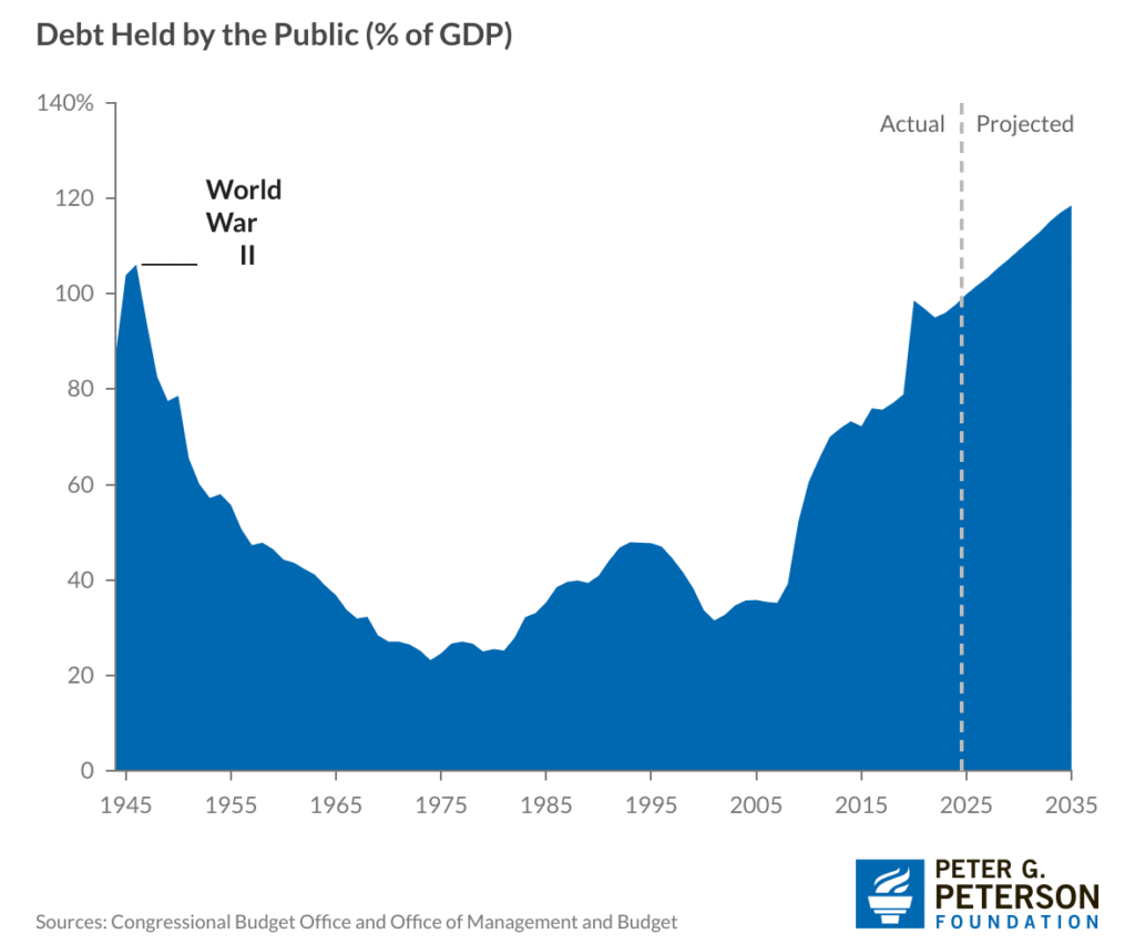 Debt held by the public (that’s money the government owes to investors, not itself) now equals about 99% of GDP, meaning it’s nearly the size of the whole U.S. economy. The Congressional Budget Office (CBO) projects that it will exceed 100% by 2026, reach 122% by 2034, and could hit 172% by 2054—far above the previous record of 106% during World War II.
